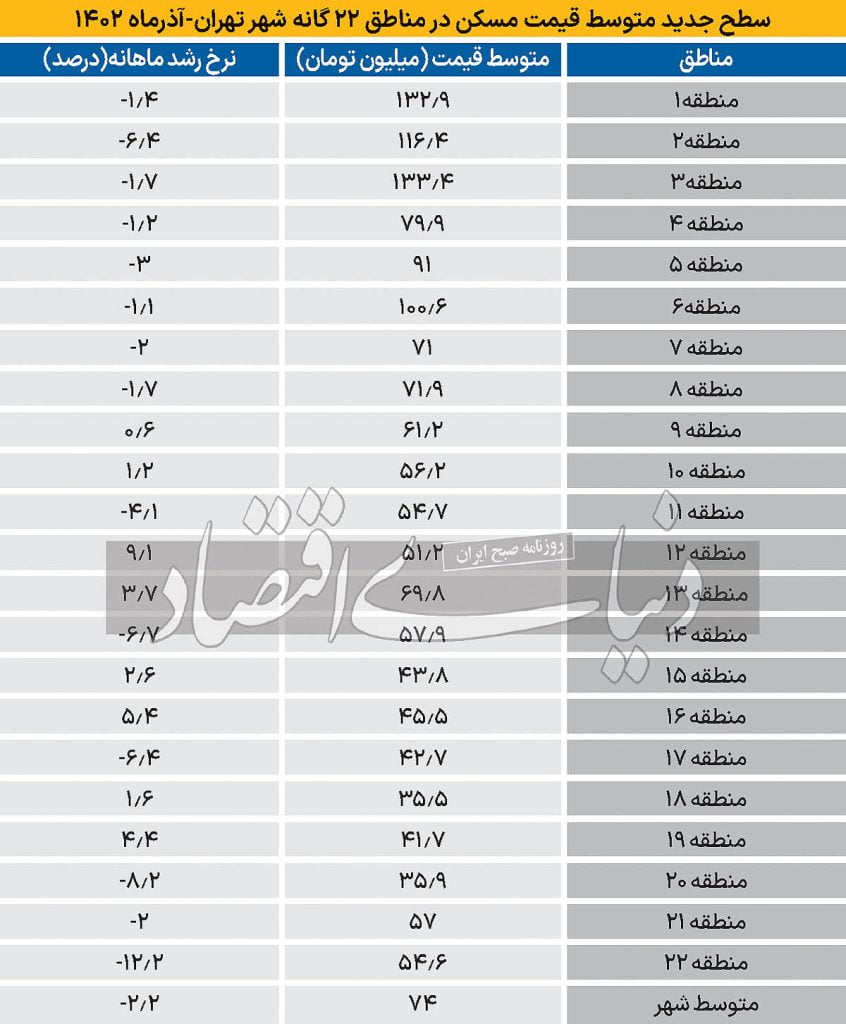 ۵ منطقه در جنوب پایتخت نیز کاهش قیمت را تجربه کرده است. اما بیشترین بازدهی منفی ماهانه یا بیشترین تورم ماهانه منفی مربوط به منطقه ۲۲ در غرب تهران بوده است. متوسط قیمت مسکن در منطقه ۲۲ شهر تهران در آذرماه نسبت به آبان ۱۲٫۲درصد افت داشته است.